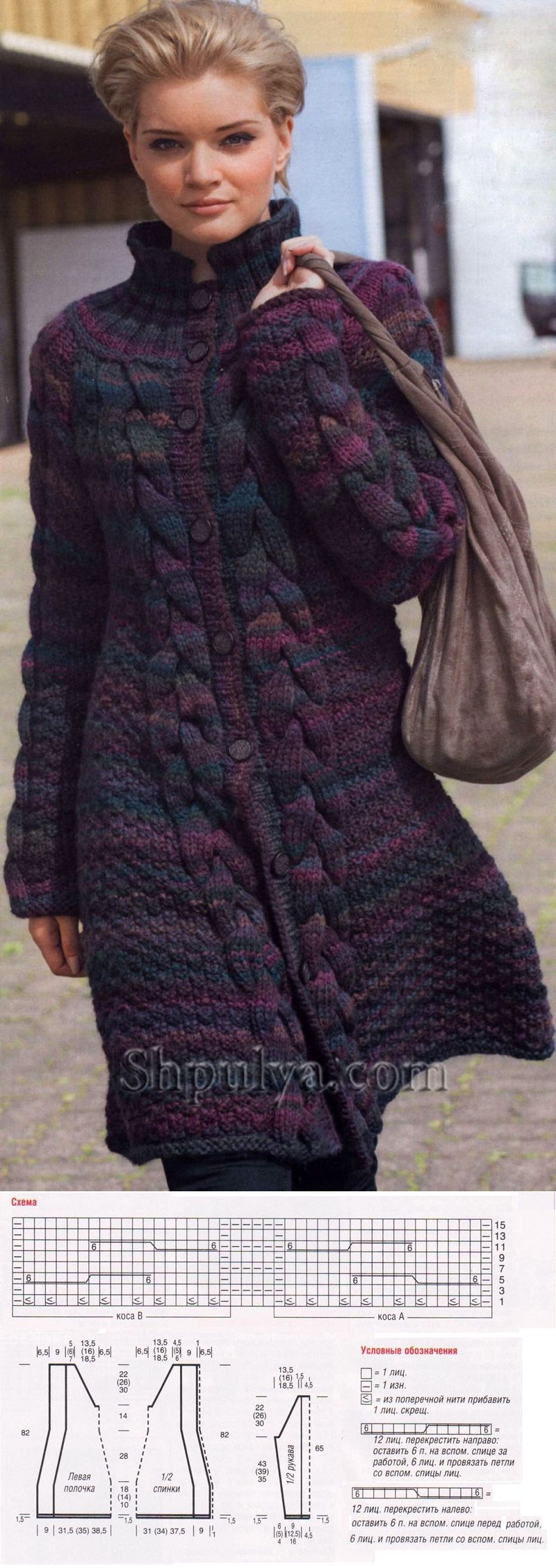 Меланжевое пальто с косами, вязаное спицами - SHPULYA.com