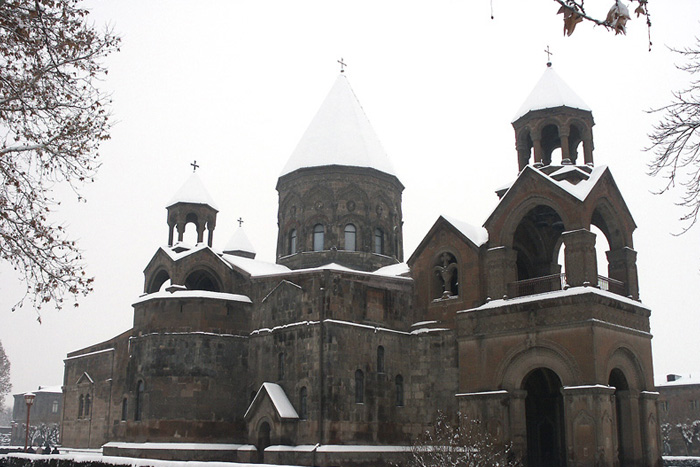 Հէնց խոնարհես աչքերդ ցած, Լայն դաշտի մէջ, առջեւդ յանկարծ Մառախուղից իր խաչի հետ Կը բարձրանայ մի սուր գմբեթ, Որ կը խօսի մարդու հոգուն՝ «Խաղաղութիւն ամենեցուն» Էնտեղ էն հին դարերից վեր Երկնաքարոզ յուժկու ձայներ, Սահակ Պարթեւ, Ներսէս Մեծին Խաղաղութիւն քարոզեցին: Էնտեղ լցուած ահեղ հոգով, Աստուածային իր տեսիլքով «Էջ Միածինն ի Հօրէ», Որ Հայաստան լուսաւորէ: Ու լոյսն առան ծաւալեցին Լուսաւորիչն ու Մեծ Տրդատ, Ու տակաւին այնտեղ կեցած Կը սաւառնին հոգիացած: Հովհաննես Թումանյան