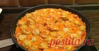 Тушеные пельмени с луком, томатами, сметаной и вустерширским соусом. Рецепт Обжарить на большой сковороде мелко нарезанный лук до золотистого цвета.