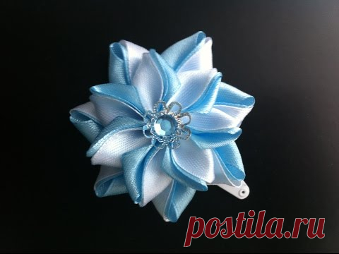 Украшение на заколку Канзаши / Бело-голубой цветок / Цветок из узких лент.