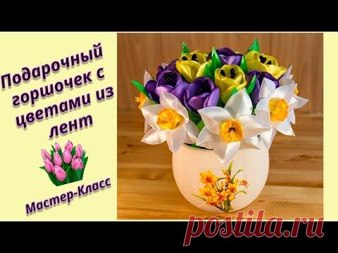 ПОДАРОЧНЫЙ ГОРШОЧЕК С ЦВЕТАМИ ИЗ ЛЕНТ ♥ МАСТЕР-КЛАСС ♥ GIFT A POT OF FLOWERS FROM RIBBONS