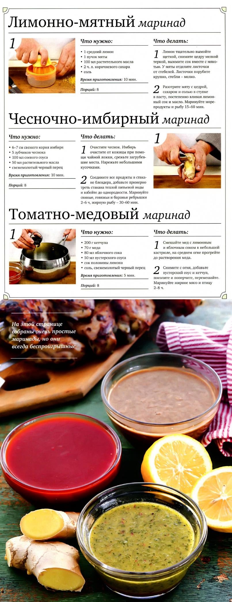 Лимонно-мятный маринад. Чесночно-имбирный маринад. Томатно-медовый маринад.