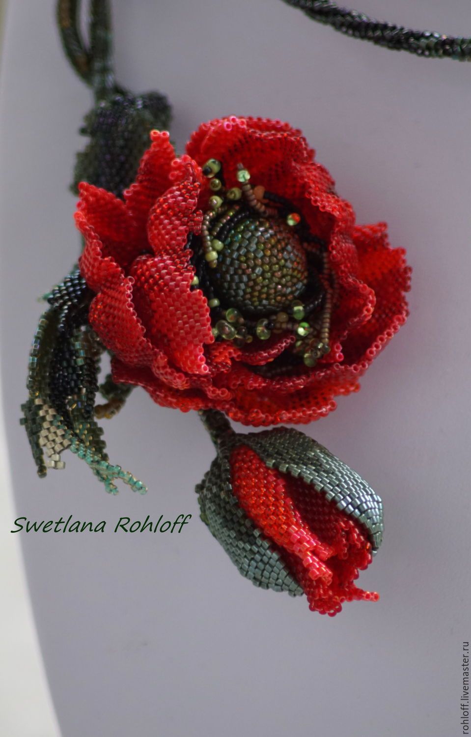 Купить Колье ,,Маки" - ярко-красный, колье, колье ручной работы, сон, голубой, нежность