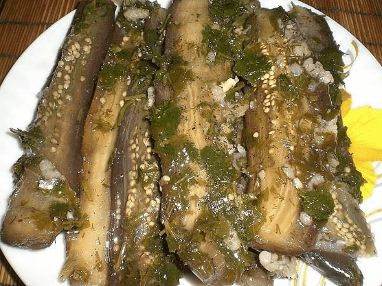 Варим баклажаны в чуть подсоленной воде, затем оставим, чтобы стекла вся вода.Затем аккуратно разрезаем баклажаны вдоль, достаем серединку и фаршируем мелко рубленным чесноком.Теперь выкладываем в глубокую емкость слой листьев сельдерея - слой баклажанов, пока не закончатся ингредиенты. Заливаем горячим рассолом (в расчете