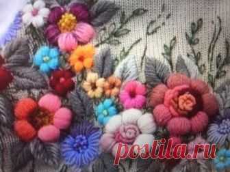 Вышивка на вязаных изделиях. Вышивка по трикотажу. Вышивка цветов. (embroidery on knitting)