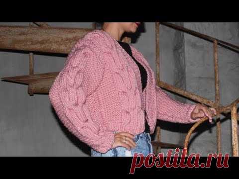 Бомбер спицами пудрового цвета с крупным узором ЦЕПЬ с толстой пряжи