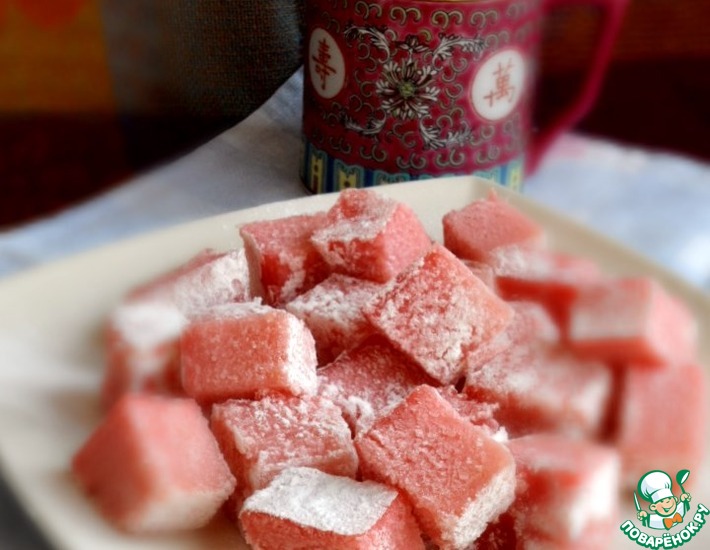 - Форму для выпечки размером 16х23 см смажьте маслом, разогрейте духовку до 180 С. Из риса Кубань приготовьте муку (я это делала при помощи кофемолки). Смешайте рисовую муку, сахар и разрыхлитель. В отдельной миске смешайте воду, ванильный экстракт, кокосовое молоко и пищевой краситель (у меня гелевый красный, достаточно 1 капли). Соедините жидкие и сухие ингредиенты вместе, хорошо перемешайте до однородности. Вылейте смесь в форму, накройте фольгой и выпекайте примерно 60 минут. У меня по истечении этого времени сверху осталась жидкость, я дополнительно выпекала еще примерно 20 минут. Оставьте моти остывать в духовке. Дайте моти полностью остыть и выложите из формы на присыпанную крахмалом поверхность. Ножом нарежьте моти на квадратики, каждый обваляйте в крахмале. Десерт получается не очень сладким, поэтому можно посыпать сахарной пудрой.