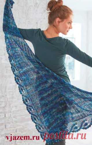 Ассиметричная шаль спицами с красивой каймой Эта ассиметричная шаль спицами с красивой каймой вяжется, начиная с более короткой стороны. В процессе работы по одной стороне петли убавляются, формируя треугольник с неравными сторонами.
