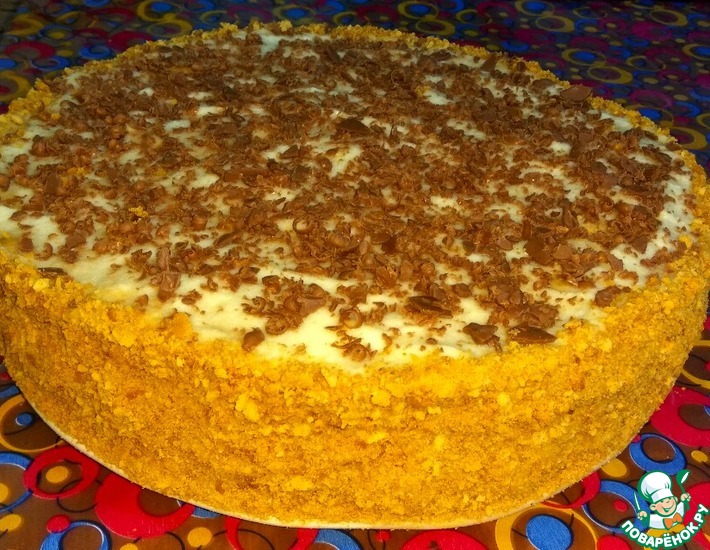 - Корж из обрезков ломаем на кусочки и измельчаем в мелкую крошку в блендере. Посыпаем крошкой бока торта, а при желании и верх торта можно посыпать крошкой. Я верх торта посыпала тертым шоколадом. Дать торту настояться сначала при комнатной температуре 1,5-2 часа, затем убрать торт в холодильник минимум на 8 часов, а лучше на ночь.
