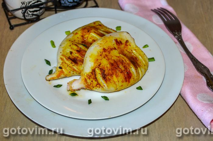Жареные кальмары на гриле (или сковороде). Рецепт с фото Способов приготовления кальмаров множество. Этот рецепт жареных кальмаров подходит как для гриля, так и для сковороды. Как обычно, тушки очищают от пленки, промывают, удаляют хорду, а затем натирают ароматным сливочным маслом с добавлением сладкой паприки, куркумы, пряных трав и соли. Для приготовления в домашних условиях удобнее покупать потрошенных замороженных кальмаров, но можно купить небольших свежих кальмаров с щупальцами. Подробнее