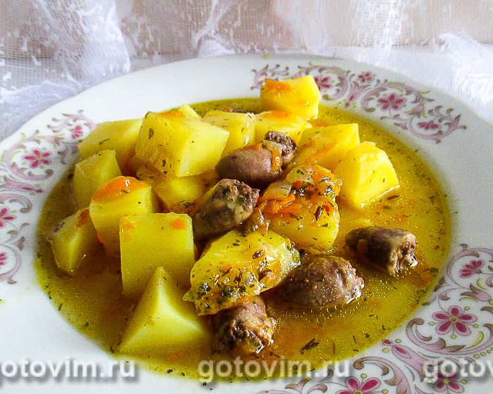 - Добавьте все специи. Готовьте до мягкости картошки. Тушёный картофель с куриными сердечками готов. Приятного аппетита!