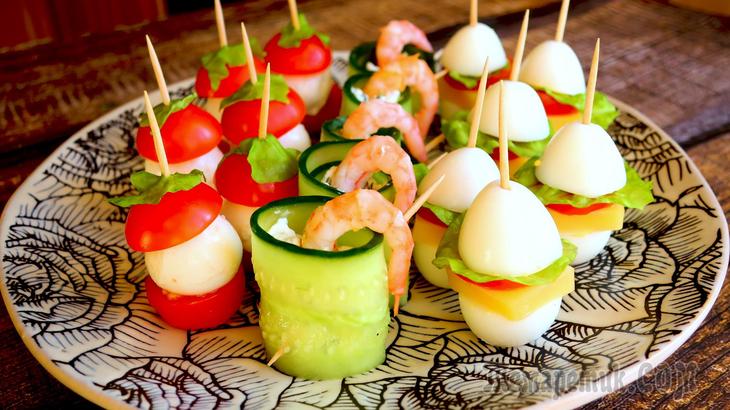 Закуски на шпажках Ингредиенты: томаты черрисыр моцарелласалат/базиликсыр полутвердыйяйца перепелинныекреветкиогурецтворожный сырзеленьПриготовление:1. Для приготовления закуски из помидор и моцареллы: помидорки разреза...