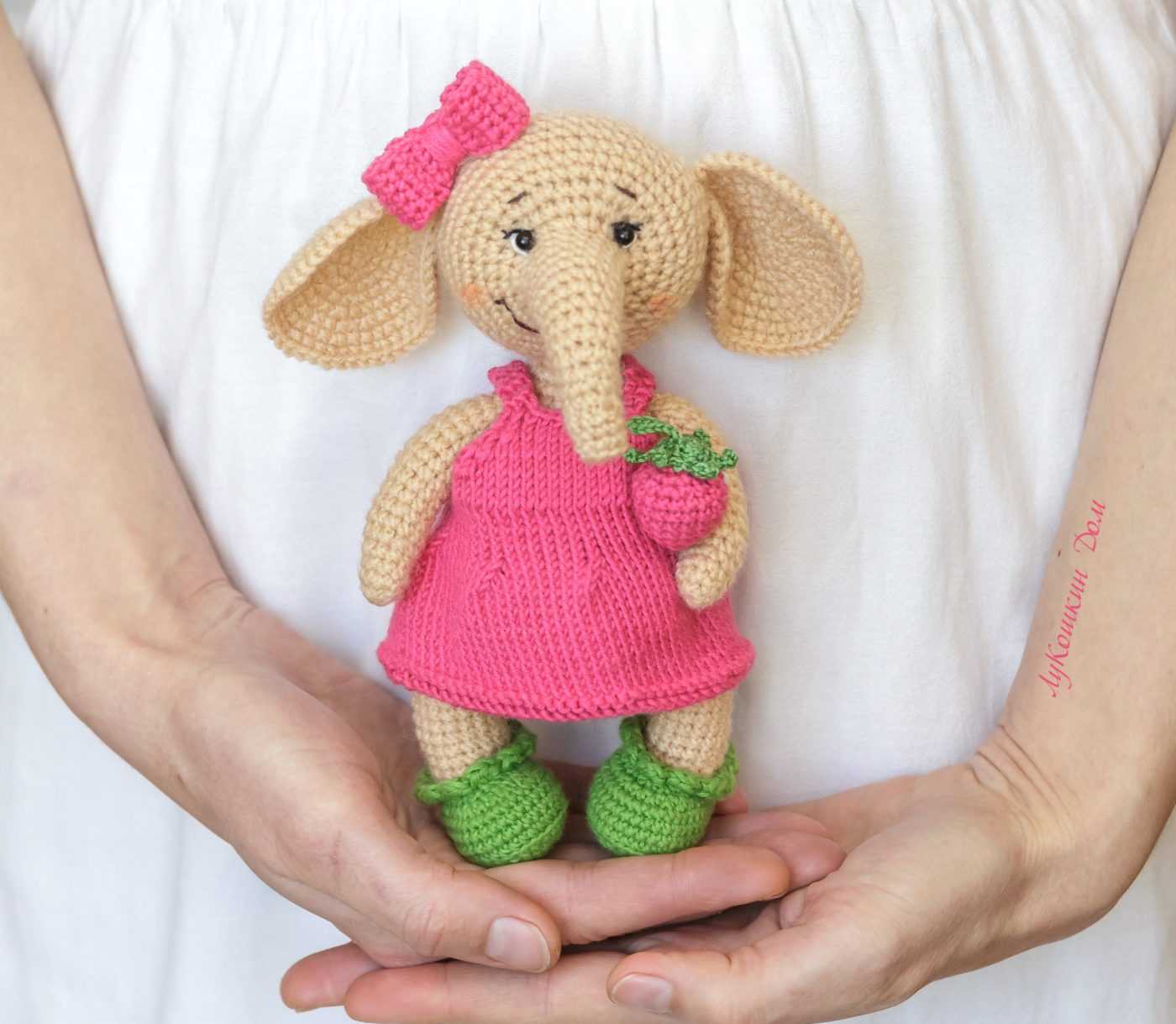 Милая вязаная слоняша . Описание .Автор: Олюшка Лукошкина - Клуб рукоделия Описание автора: Голова: Начинаем с хобота: 1 р. - 2вп-6сбн (6 сбн в кольцо амигуруми) 2 р. - (приб + 1 сбн) * 3 раза = 9 сбн 3 р. = 9 сбн за заднюю стенку