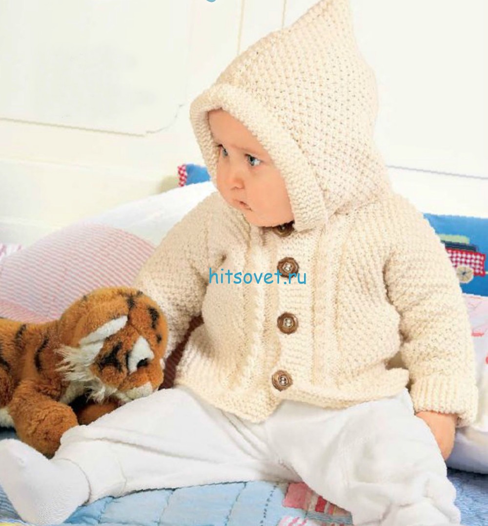 Жакет с капюшоном для малышей - Хитсовет Жакет с капюшоном для малышей. Для вязания детского жакета Вам потребуется. 300 (300) 350 г белой пряжи Merino Extra Fine (100% мериносовой шерсти, 105м/50г), спицы № 4, круговые спицы № 4, 4 (5) 5 пуговиц.
