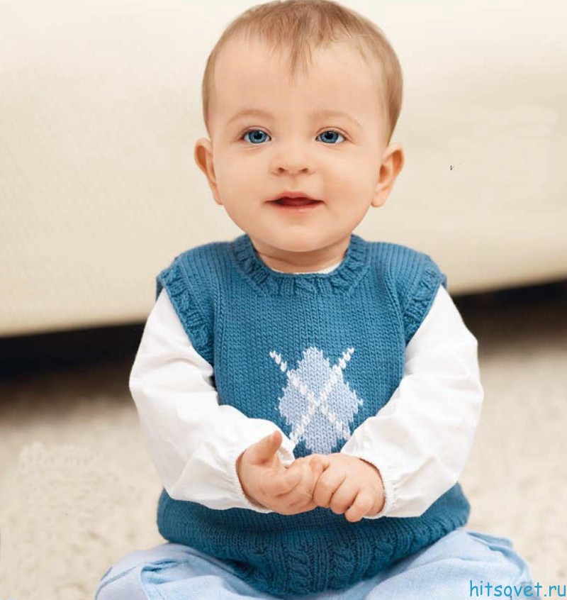 Безрукавка для мальчика спицами - Хитсовет Безрукавка для мальчика спицами. Вам потребуется: 100(100) 150 г серо-синей, 50 г голубой и немного белой пряжи Bаbу Саshmегinо (55% мериносовой шерсти, 33% микроволокна. 12 % кашемира, 125 м/50 г); спицы № 3 и № 3,5, круговые спицы № 3, 2 пуговицы