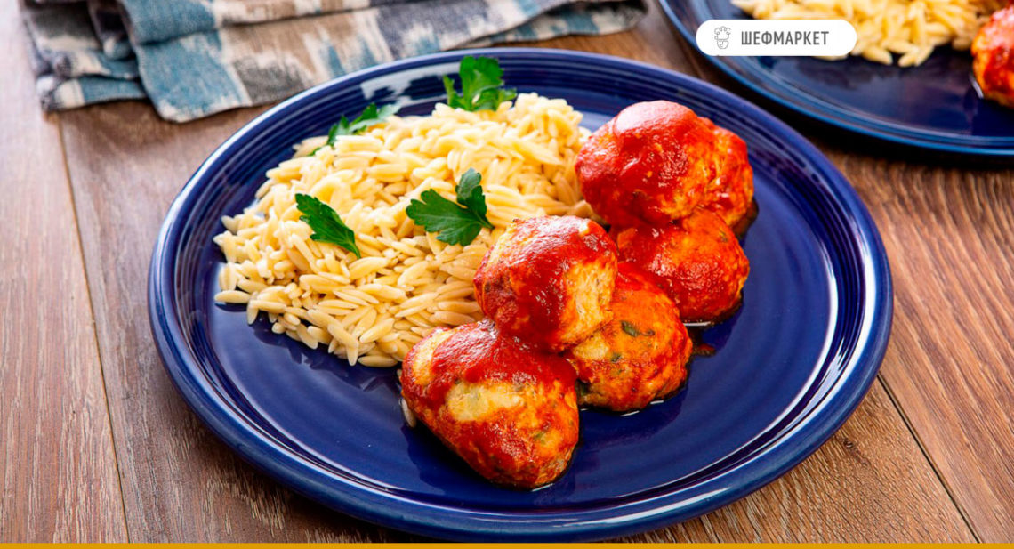 Куриные фрикадельки с оливками и пармезаном, запечённые с томатным соусом, с пастой орзо | Что приготовить на ужин?