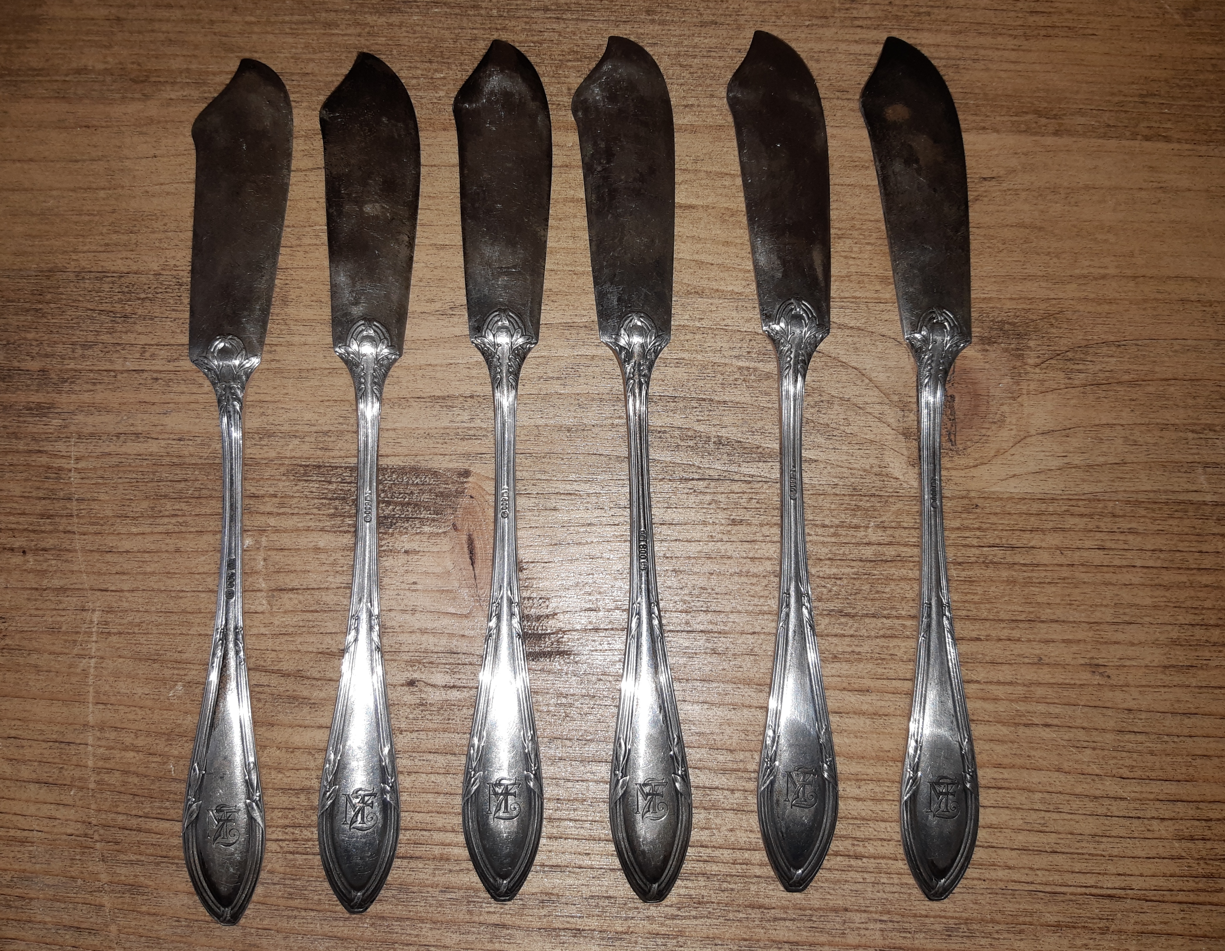 Ножи для торта с монограммой "MZF". Столовое серебро. 800 проба. Германия. Клеймо. Набор. Общий вес : 290 грамм. Размер : 200 (85) х 22 мм. Цена : 14 000 руб.