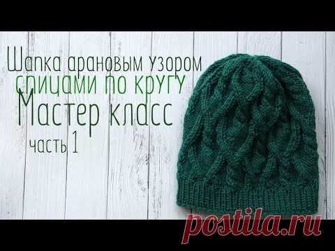 Мастер класс, шапка спицами арановым узором, связанная по кругу часть 1