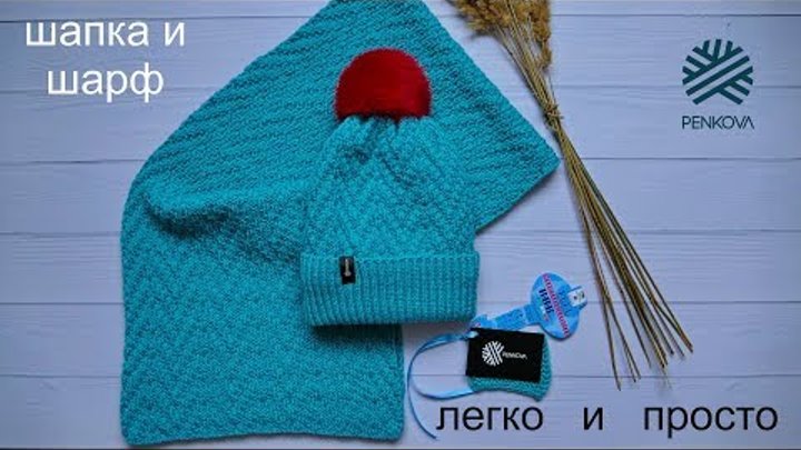 Шапка и шарф (палантин). Зимние аксессуары.Узор ромбы спицами. Шапка с отворотом. Палантин