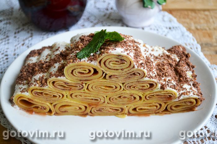 Блинный торт с малиновым конфитюром. Рецепт с фото Блинный торт - обязательно станет украшением любого праздничного стола. Для начинки подойдет любой конфитюр, джем или варенье, а также ягоды и фрукты по вашему вкусу. В этом рецепте каждый блинчик, прежде чем скрутить в трубочку, смазали малиновым конфитюром. Уже собранный торт из блинов щедро смазывают взбитой с сахаром сметаной и убирают в холодильник. Перед самой подачей блинный торт украшают тертым шоколадом. Подробнее