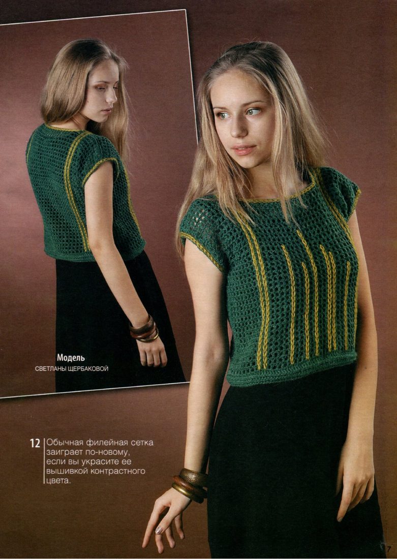 Топ-сетка с вышивкой Для создания оригинальной вязаной вещи не всегда стоит прибегать к сложным схемам. Иногда достаточно добавить какой-то необычный элемент, и рядовое изделие будет выглядеть оригинально. Предлагаем схему вязания топа-сетки, в котором реализована данная идея – он украшен контрастной вышивкой. Предлагаемый топ крючком можно носить как легкий пуловер с короткими рукавами и как жилет, поддев водолазку или … Подробнее "Топ-сетка с вышивкой"