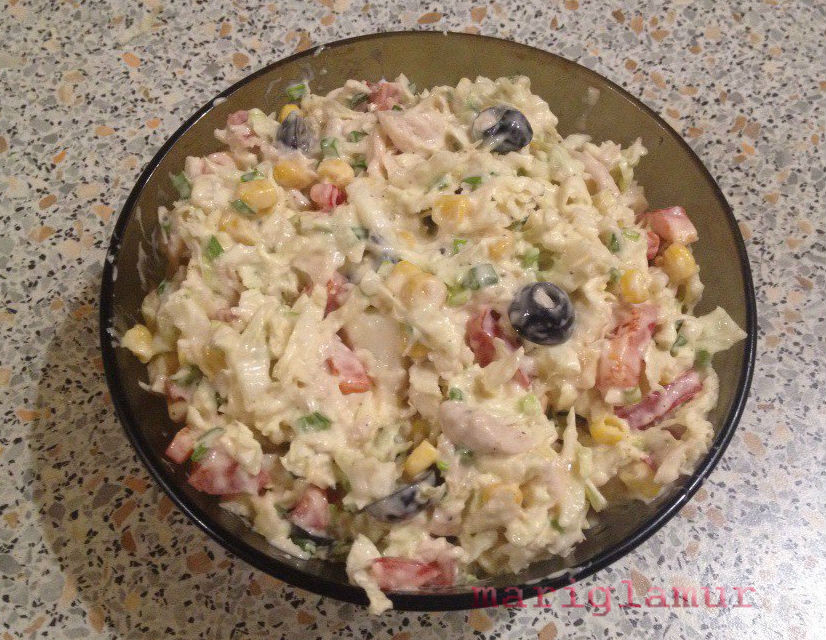 Салат из перца, курицы и капусты Рецепт приготовления салата из пекинской капусты, болгарского перца и курицы. Состав: 1 упаковка пекинской капусты 2 болгарский перец 150 грамм отварной куриной грудки 1 банка консервированной кукурузы 1 пучок зеленого лука 1 столовая ложка оливок 1 чайная ложка горчицы майонез для заправки черный перец по вкусу Приготовление: Курицу порезать кусочками. Лук помыть и мелко порезать. Оливки …
