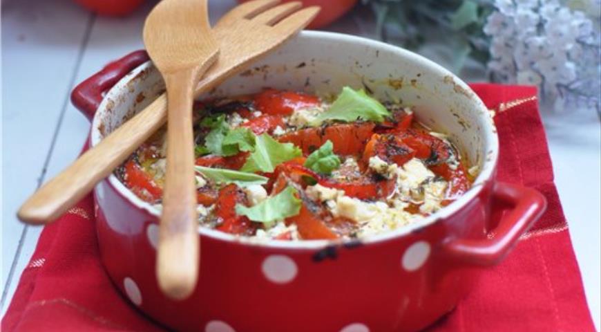 - Сверху плотно уложить нарезанный кружочком помидор. Фету нарезать ломтиками, уложить поверх помидора, далее по желанию выложить чили с болгарским перцем, немного полить оливковым маслом, посыпать рубленным орегано. Можно добавить свежемолотого черного перца, он отлично подчеркивает вкус помидоров.
