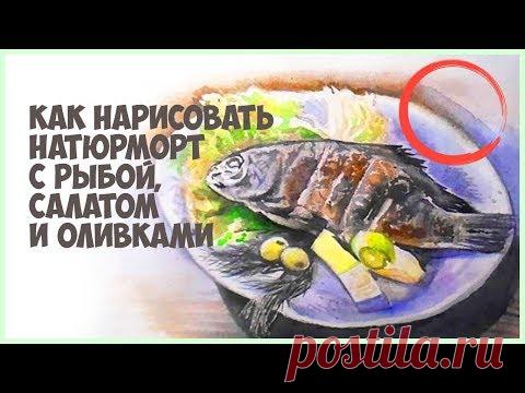 Как нарисовать натюрморт акварелью с рыбой и оливками. Поэтапное видео