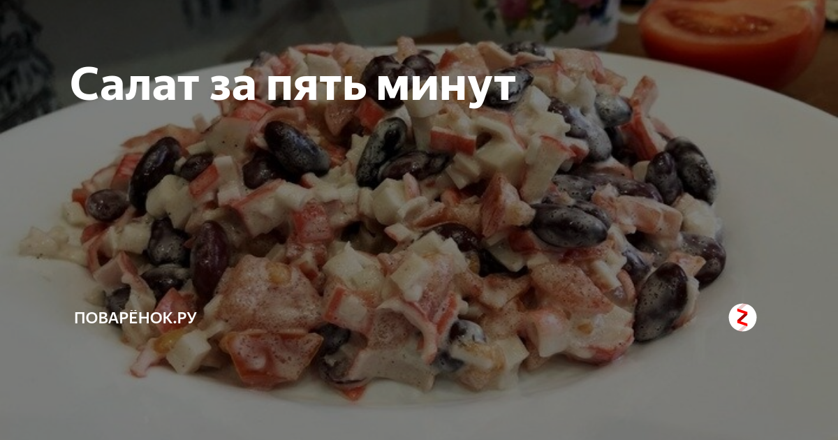 Салат за пять минут Это легкий и простой в приготовлении салат, который можно приготовить очень быстро. Если заменить майонез на натуральный йогурт, то он подойдет тем, кто следит за своей фигурой.