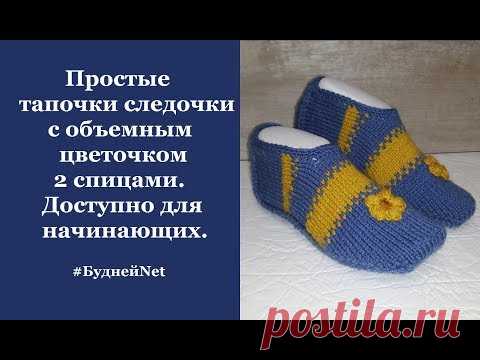 Простые тапочки следочки с объемным цветочком 2 спицами. Доступно для начинающих.