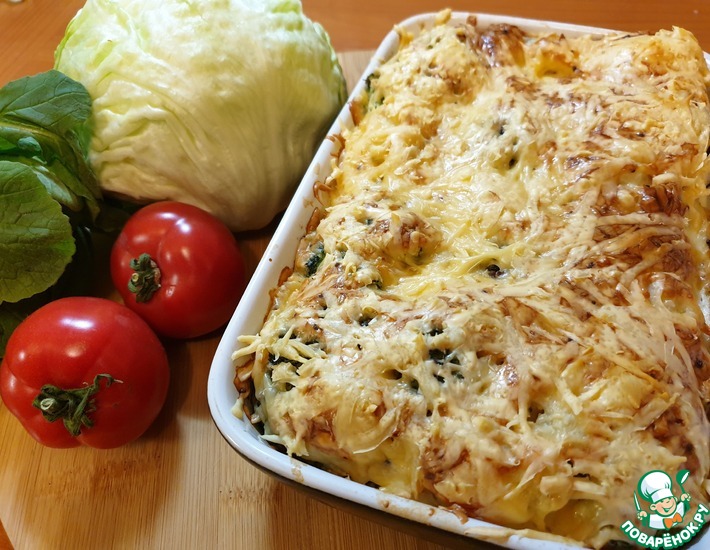 - Смажьте форму (у меня размер 15х21 см) для выпечки маслом и выложите капусту.