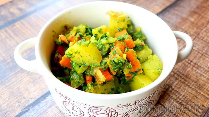 Ароматное овощное рагу из запеченных овощей Ингредиенты: морковь - 400 г.картофель - 400 г.лук - 1 шт.чеснок - 2 зуб.шпинат - 200 г.сольперецпаприка - 1 ч.л.куркума - 1 ч.л.имбирь - 1/2 ч.л.тимьянрозмаринмускатный орех - 1/4 ч.л.вода - 100 мл.П...