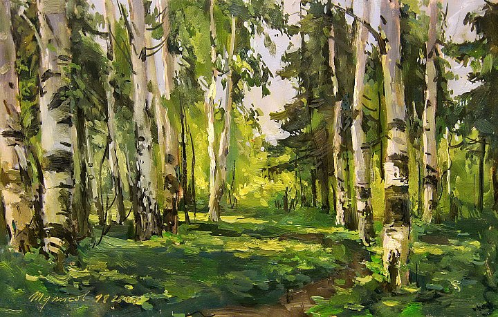Святая простота. Художник Владимир Туписов Березовая роща Май в деревне Вишня цветет Луг, околица, домишко,Лай собаки во дворе,Воздух свежим сеном дышит, Растворяясь в синеве,Солнцем залитого неба,Веселится ясный день,Топится с душистым хлебомПечь, отбрасывая тень, На укромное хозяйство,На уют древесных стен,Где давно не просыпалсяДух...