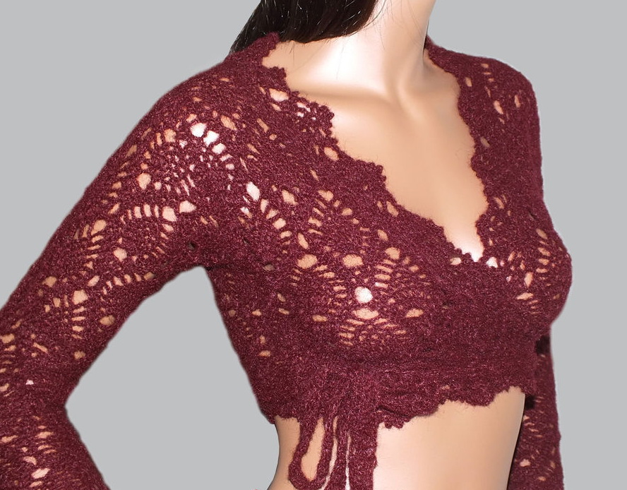 Узорный бордовый жакет спицами