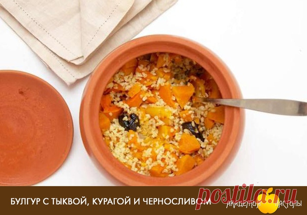 Булгур с тыквой, курагой и черносливом Наш эксперт Лена Ярцева специально для вас подготовила этот постный и вкусный рецепт! Заморскую модную крупу Булгур (дробленую пшеницу) Лена приготовила по-русски, с тыквой и сухофруктами в керамическом горшке. Получилось необыкновенно вкусно. Ингредиенты -Булгур 1 стакан -Вода 2 стакана -Порезанная кубиком тыква 300 г -Курага, чернослив 100 г -Соль, масло по вкусу Рецепт 1.Всыпать стакан крупы в горшок, добавить порезанную тыкву ...