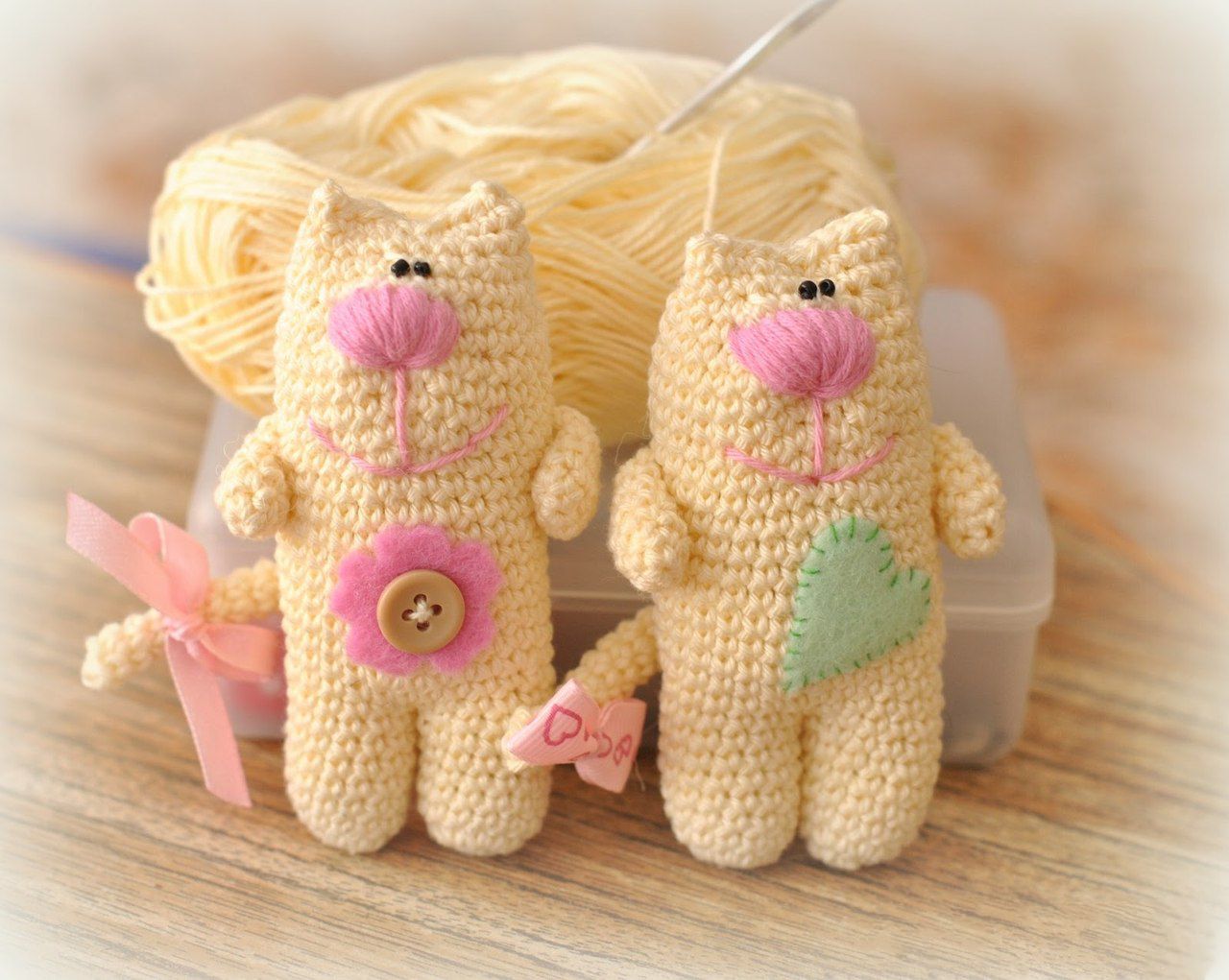 Вяжем милых котиков из хлопковой пряжи Начинаем с нижних лапок: 1ряд - 2 в.п., 6 СБН во вторую петлю от крючка. 2 - прибавка в каждую петлю. Провязать 6 рядов без изменений. Связать вторую лапку, соединить с первой. 9 - 10 вязать по кругу.