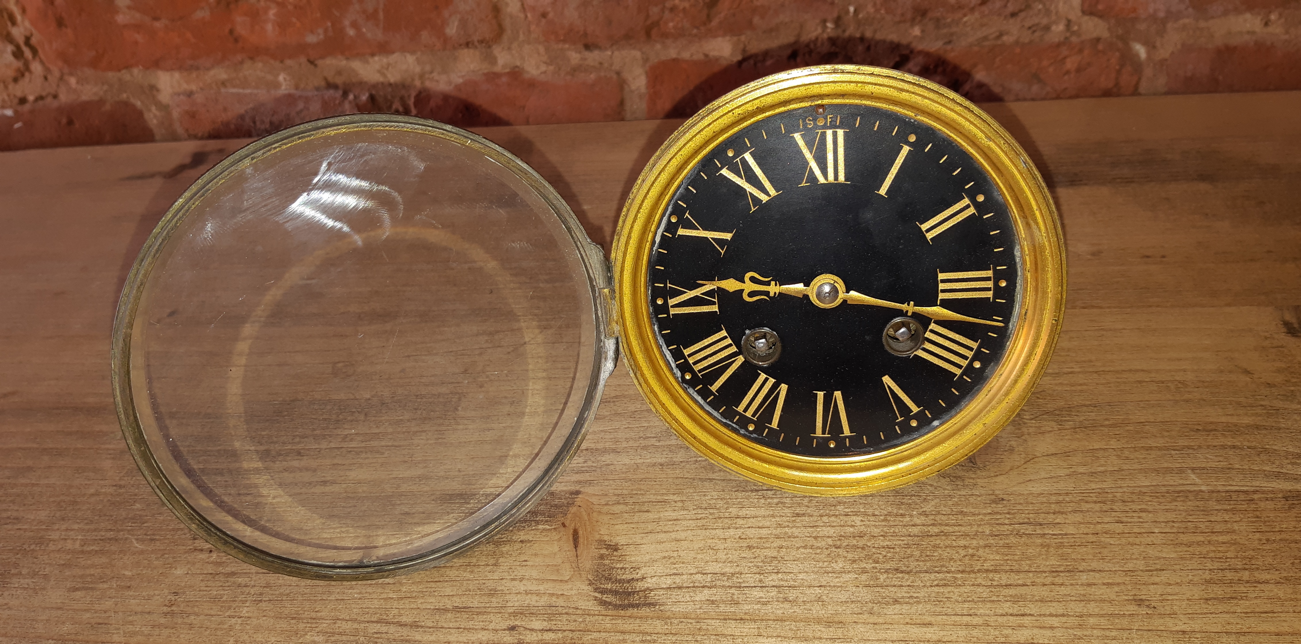 Часовой механизм с фасетным стеклом. 19 век. Циферблат чёрная эмаль. Диаметр циферблата : 115 мм. Рабочие. Все деталии и пружины на месте, кроме маятника. Требуют чистки и смазки.