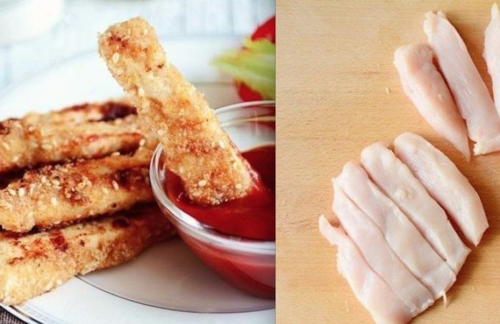 Этому блюду меня научила подруга из Лондона. Хрустящие куриные «Пальчики» Ингредиенты: 500 гр куриного филе 1 ст. панировочных сухарей (желательно крупных) 0,5 ст. кефира 3 ст. л. кунжута 2 зубчика чеснока 2 ч. л. молотой сладкой паприки соль, перец – по вкусу Приготовление: Куриное филе отбить обратной сторона ножа и нарезать длинными кусочками 2-3 см толщиной...