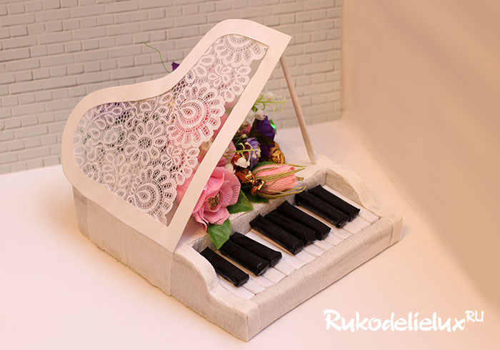 В этом уроке я покажу как сделать рояль из конфет своими руками с пошаговыми фотографиями. Такой сладкий подарок придется по душе девушке, работающей учителем музыки.