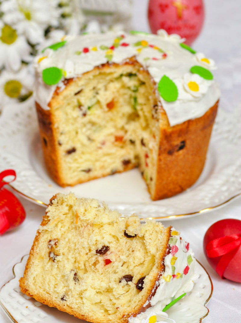 Пасхальный Кулич с изюмом, и цукатами, в глазуриДолго не черствеет! Кроме того он мало затратный и получается у всех- проверено!
