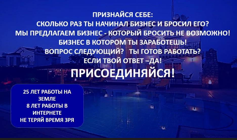 Я здесь потому, что мне нужны деньги здесь и сейчас! И спасибо компании и за надежность и за возможность! Нужны деньги? Не теряйте время зря, присоединяйтесь, зарабатывайте и решайте свои проблемы. Доказано, что наличие денег решает 90% всех проблем! Официальная компания работает 25 лет на земле и 8 лет в интернете.
