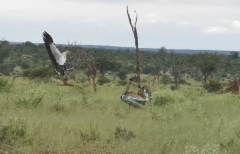 Как птица-секретарь досаждала африканской дрофе В парке Крюгера туристы вновь увидели запоминающуюся сцену сражения — в этот раз между представителями орнитофауны.Эшли Деннисон (Ashlea Dennison),