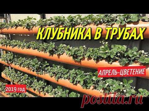 КЛУБНИКА В ТРУБАХ/Весна-цветение клубники в грядках из трубы.