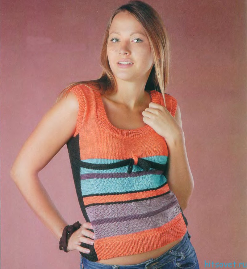 Топ спицами из остатков пряжи - Хитсовет Топ спицами из остатков пряжи. Вам потребуется: пряжа (100% микрофибра, 152 м/50 г) -100 г черного цвета, 50 г оранжевого цвета, остатки фиолетового, сиреневого и голубого цветов, спицы №,2, №3 и №4.