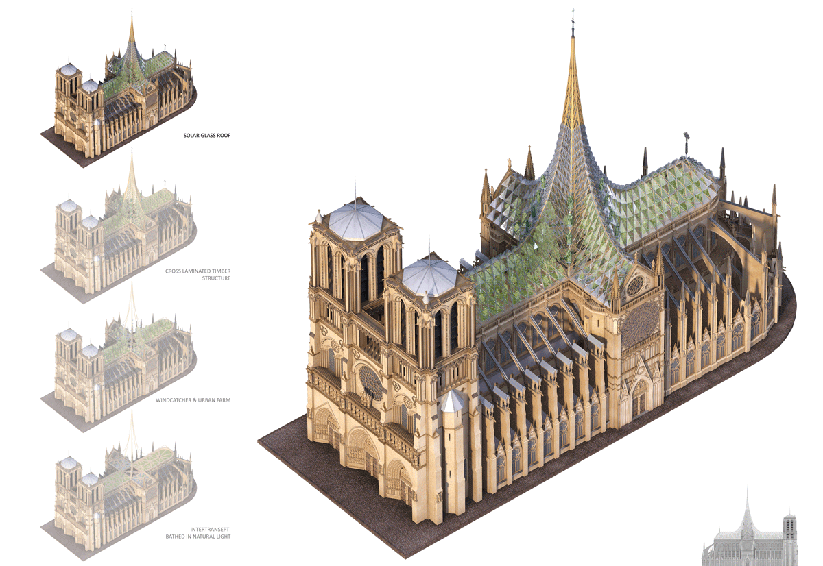vincent callebaut предлагает объединить неф, крышу и шпиль Нотр-Дам