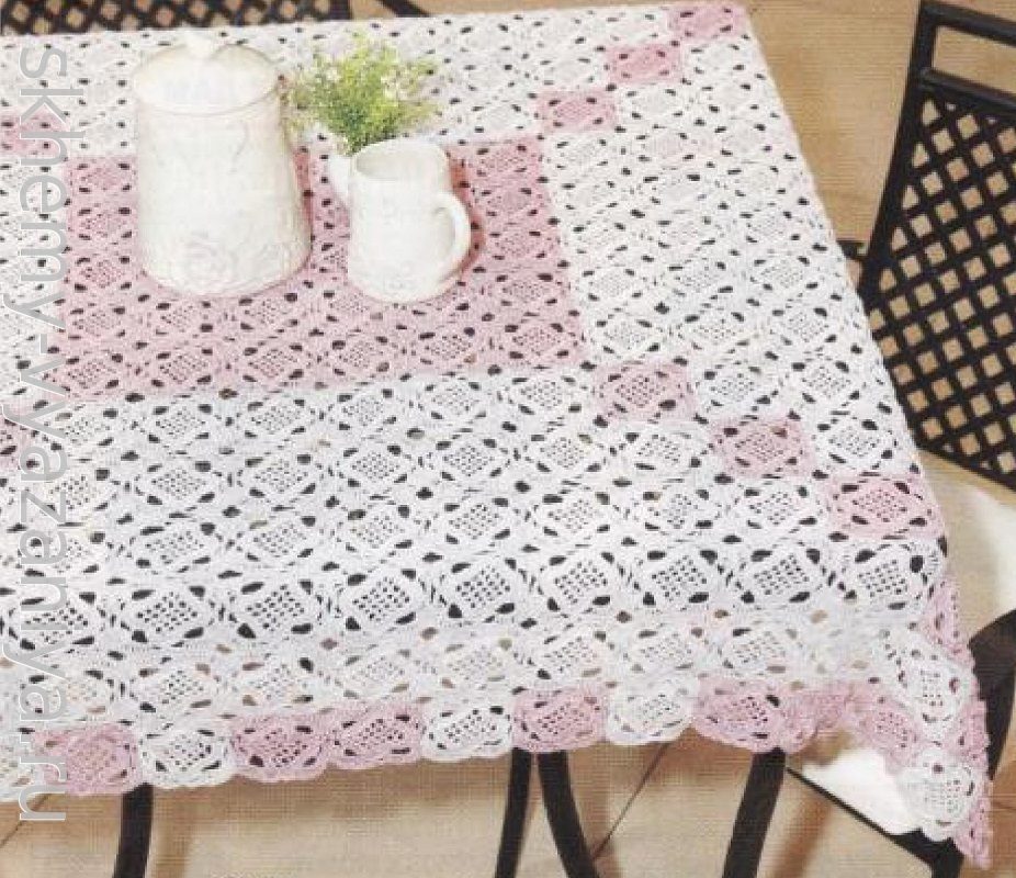 Двухцветная скатерть из ажурных квадратов. Схема вязания крючком и описание.
