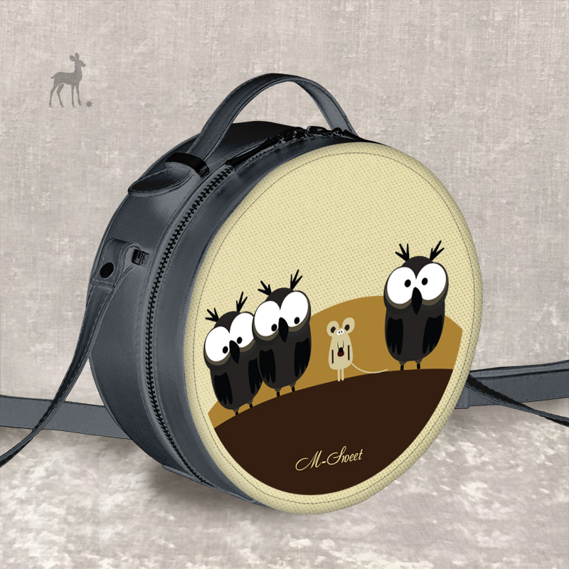 Прикольная сумочка с совами из клипа Сумка Совы Нежные - это самая прикольная сумка нашего магазина)) Эти глазастые совы и мышка поют в одном оркестре под офигенную песню. Сумка выполнена из темно-серого материала, но при желании заказчика ее можно изготовить в любом цвете. На задней стороне сумки с внешней стороны имеется потайной карман на молнии. Внутри тоже два небольших кармана. На заказ мы изготовим сумочку любого размера и формы с любым рисунком.