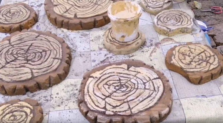 Плитка в виде древесных спилов без заливочных форм Плитка для садовых дорожек – удовольствие не из дешевых. Тем более, если вам не по душе обычные серые кирпичики, а хочется чего-нибудь
