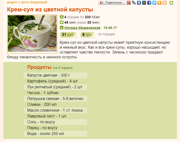 Рецепт: Крем-суп из цветной капусты на RussianFood.com