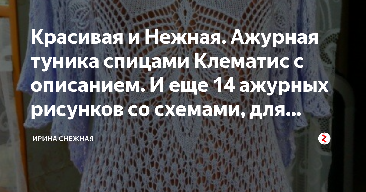 Красивая и Нежная. Ажурная туника спицами Клематис с описанием. И еще 14 ажурных рисунков со схемами, для вашего творчества! Здравствуйте девочки рукодельныцы и мастерицы! :) Сегодня маленький пост и об одной, но очень красивой тунике "Клематис". Автор создания этого шедевра LaVera . Туника связана по описанию и схемам шали "Клематис". Уровень сложности работы средний и чуть выше. А кто из вас девочки мастерицы, имели опыт вязания шалей - наверное справятся с легкостью. Схемы